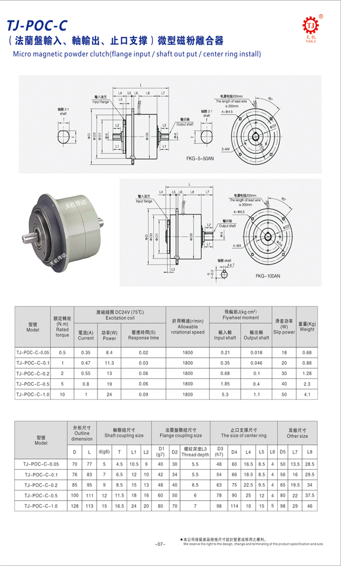 天機傳動(TJ-POC-C)小型號磁粉離合器,微型磁粉離合器的激磁電流雖小,但卻可以輸出較大轉(zhuǎn)矩,從而可以很方便地組成自動控制系統(tǒng)。此外當(dāng)激磁電流發(fā)生變化時,與之對應(yīng)的磁場強度也隨之同步響應(yīng),而也因此具備優(yōu)越的響應(yīng)速度。當(dāng)激磁電流保持不變時,其輸出之轉(zhuǎn)矩不受傳動件與從動件之間差速(滑差轉(zhuǎn)速)之影響,即靜力矩與動轉(zhuǎn)矩?zé)o差別。因此可以非常穩(wěn)定地輸出恒定轉(zhuǎn)矩。此特性若應(yīng)用于張力控制,則只須調(diào)節(jié)激磁電流之大小,便可簡潔、有效、準(zhǔn)確地達(dá)到控制卷料張力的目的。