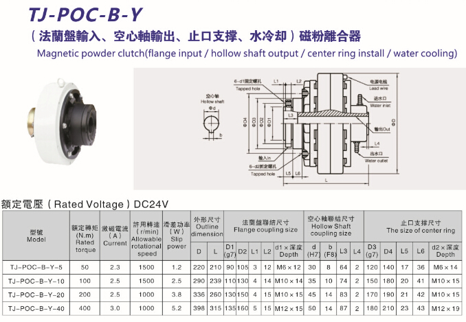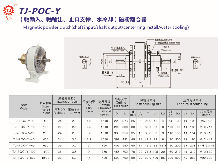 天機(jī)牌帶機(jī)座水冷式磁粉離合器TJ-POC-Y的安裝尺寸和具體型號參數(shù)如下: