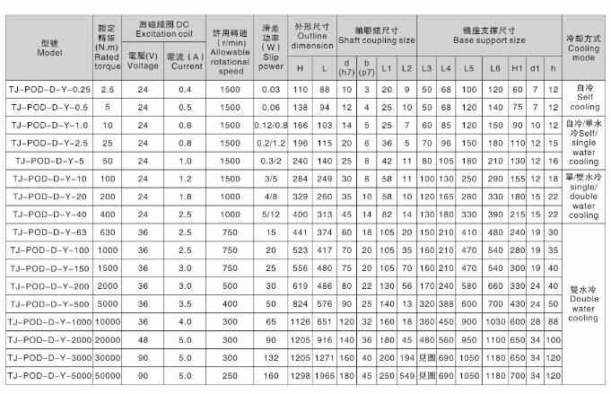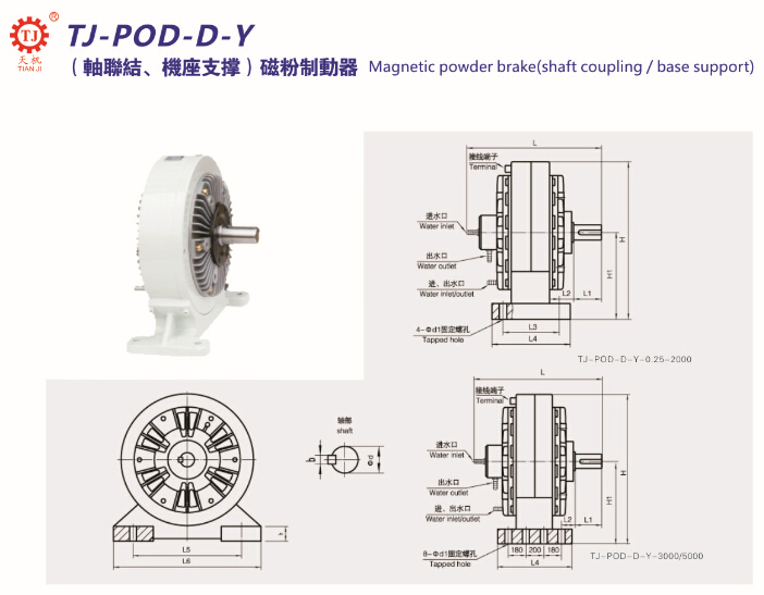 單軸機座式磁粉制動器(TJ-POD-D-Y)的安裝尺寸及型號參數(shù)如下: