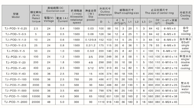 天機(jī)牌水冷式磁粉制動(dòng)器(TJ-POD-Y)的安裝尺寸和具體參數(shù)如下:
