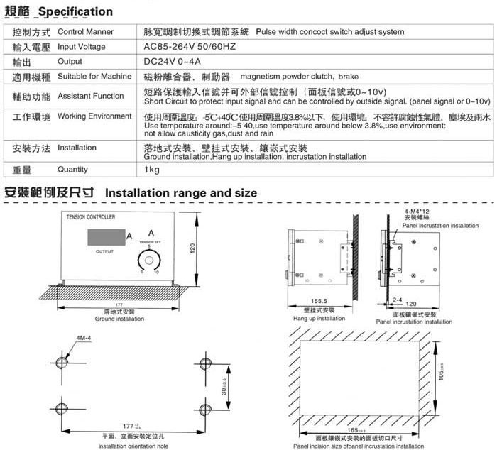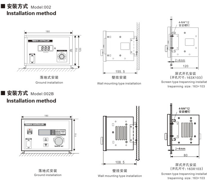自動(dòng)張力控制器(張力控制系統(tǒng))的安裝方式,常見的有三種:壁掛式安裝、落地式安裝、面板鑲嵌式安裝,關(guān)于其接線情況參考產(chǎn)品使用說明書。 具體規(guī)格和及安裝尺寸如下:
